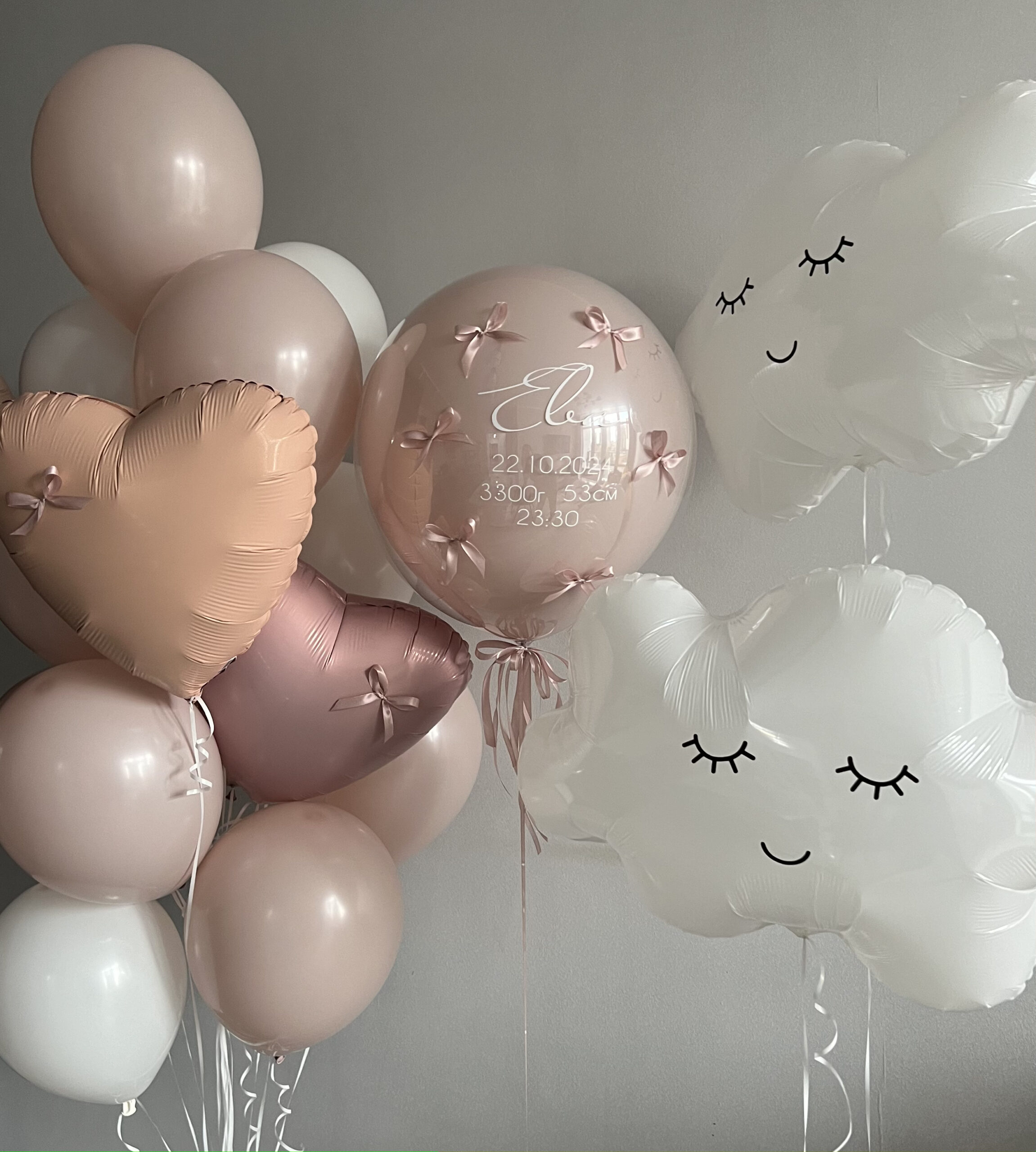 - Шар «Дабл-Стафф» 70 см + надпись + бантики– 1 шт.