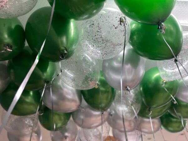 Шары под потолок «Хром серебро, Зеленые металлик, Шары с конфетти»